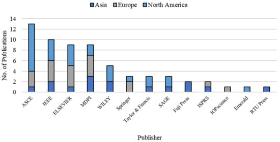 Figure 3 provides an overview of the region-based distribution of the compiled articles and provides the publisher count. North America had the highest number of publications during the study period (twenty-eight articles), majority of them being conducted in the United States, followed by Europe (nineteen articles) and Asia (fifteen articles). The figure illustrates the publishing house portraying the descending order of the number of studies published dealing with the UAV applications in bridge monitoring. It can be observed that ASCE is the leading publisher in this category with thirteen published papers, nine of which were conducted in North America, three in Europe, and one in Asia. This is followed by IEEE with ten published articles and Elsevier and MDPI with nine articles each. Appendix A illustrates the research data extracted from the compiled studies including year of publication, publication type, type of utilized NDT technique, method of validation, test object, type of measurement, data acquisition tools, software platforms, and data processing algorithms including artificial intelligence or machine learning techniques.