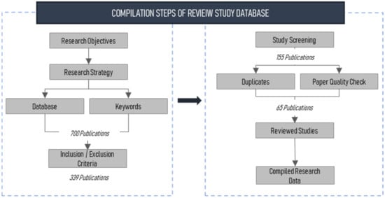 Figure 4 illustrates the protocol followed during the compilation process of the review study database. The studies were retrieved primarily from Google Scholar, Scopus, and Web of Science databases. The studies compiled for this review were extracted using a combination of the following search keywords: “Unmanned Aerial Vehicles”, “Unmanned Aerial Systems”, “Drones”, “Remotely Piloted Aircrafts”, “Aerial Vehicles”, “Aerial Systems”, “Non-contact Technologies”, “Non-destructive Technologies”, “Bridge Inspection”, “Bridge Monitoring”, “Structural Health Monitoring”, “Bridge Condition Monitoring”, “Bridge Damage Quantification”, and “Bridge Deterioration”. The keywords were initially identified based on the authors’ knowledge of the research area. Subsequent to the retrieval of the first set of articles, additional keywords from the extracted studies were used to retrieve more articles. The two-step technique for identifying keywords was adopted to obtain a comprehensive set of relevant articles in this field of research. Preliminary search revealed close to 700 studies on this topic. Screening of irrelevant/duplicate studies retained a total of one hundred and fifty-five articles relevant to the scope of work. Finally, after abstract and full-text screening, sixty-five articles were selected for review.