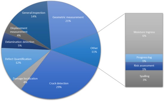 UAVs can be defined as aircrafts that operate or function without an on-board pilot. Although they are also widely known as drones, remote piloted aircrafts (RPA), or unmanned aerial systems (UAS), there are subtle differences between each terminology. Drones typically refer to any remotely controlled vehicle including submarines or surface-based autonomous vehicles, whereas a UAV is an aircraft capable of flying remotely or autonomously over long distances with the aid of a control device transmitting live feed []. On the other hand, UAS refers to the complete system that encompasses UAVs and drones, the ancillary units, as well as the operator on ground. Initially used in military applications, they have been gradually moving towards commercial and consumer use over the past decade which has provided several opportunities for built environment disciplines []. UAVs equipped with NDTs or remote sensing mechanisms offer inspection and monitoring capabilities for engineers, decision makers, stakeholders, and owners of bridge infrastructure to survey and document structural condition, assess safety performance, and deploy mitigation and rehabilitation strategies if and when necessary. On the basis of the articles reviewed in this study, the NDT technologies frequently incorporated with drones for bridge inspection are presented in this section. Visual imaging techniques, consisting of photo and video cameras, were the most commonly used NDT techniques for drone-based data acquisition, followed by IRT, LiDAR, and sensors (refer to Figure 2). The present section also discusses studies that explored the comparison and integration of multiple NDT-UAV systems. The initial analysis of the current study attempted to identify the major areas of application of the NDT-UAV in monitoring bridge condition. The analysis indicated that majority of the applications focused on the detection of cracks on bridge structures. Geometric measurement of bridge elements was another important application, followed by general inspection, defect quantification, and identification of moisture ingress. Delamination detection, damage localization, displacement measurement, identification of spalled surfaces, risk assessment, and maintenance of a progress log are other useful function NDT-UAVs can serve. Figure 5 gives an overview of the NDT-UAV applications in bridge condition monitoring.