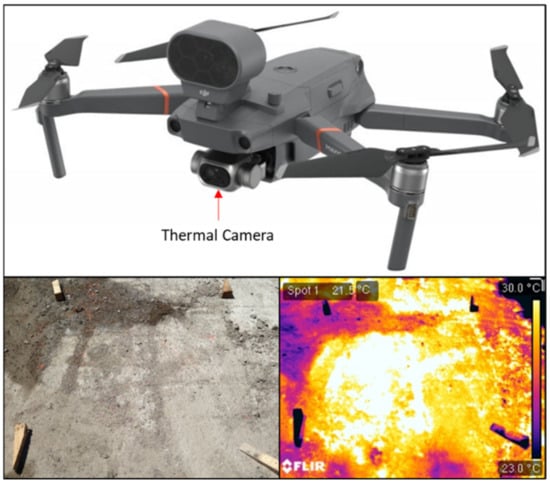 IRT is an NCT technology capable of sub-surface damage detection [,]. Figure 7 illustrates an IRT-based UAV system and a sample of the IRT data acquired. This technique distinguishes between delaminated and non-delaminated concrete/pavement surfaces based on the temperature gradient of the surfaces under natural (passive thermography) or artificial (passive thermography) heat exposure. Areas above delamination will be identified as hotter than corresponding areas above sound concrete as delamination disrupts heat transfer. Very few studies explored the utilization of thermography-based UAVs in bridge condition monitoring. One such study acquired thermal images of two in-service concrete bridge decks using a low altitude aircraft mounted with an IR camera []. The areas of subsurface defects identified by the IRT-UAV system were validated against traditional techniques such as half-cell potential (HCP) and hammer sounding. The results indicated that hammer sounding was approximately 9% more accurate in delamination detection compared to IRT-UAVs. On the other hand, the proposed system demonstrated 6 to 8% higher accuracy when detecting subsurface defects compared to HCP which was attributed to the latter’s capability of only detecting areas with advanced corrosion activity. Another study analyzed the usefulness of airborne IRT systems for passive thermography of artificial delamination on a concrete bridge deck specimen []. The absolute contrast generated by IRT-UAVs were observed to be slightly less intense when compared to a handheld IRT camera. However, similar to the handheld system, the IRT-UAV was proven to be capable of identifying delamination up to 4 cm deep and having width–depth ratios not less than 1.9. The study also indicated that delamination was observed more clearly in instances where the width–depth ratio was larger due to higher temperature difference being generated.