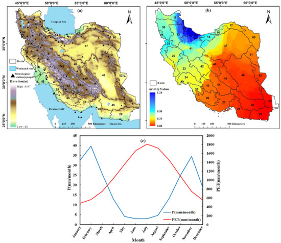 Iran is located 25°4′ N–39°46′ N latitude and 44°2′ E–63°19′ E longitude (Figure 1a), with access to the sea in north and south. The mean annual precipitation (P) over Iran is 311 mm, and the mean annual temperature (T) is 16.7 °C [6]. Based on the UNEP climate classification [32], most parts of Iran have an arid and semi-arid climate, but some areas in the north-west have a dry sub-humid climate, and the north has a humid climate based on global aridity values (Figure 1b). Iran has 30 main independent basins with different amounts of P and potential evapotranspiration (PET) based on their climate zones. In Figure 1 each basin is represented by a specific official two-digit code. For example, basin 12 (Figure 1b) in the north of Iran has the highest mean annual precipitation (1187 mm), whereas basin 47 located in the center has the lowest (77 mm). These basins have mean annual PET of 787 and 1083 mm, respectively (Supplementary Table S1), about 10 times higher than precipitation. Iran experiences high mean PET in June-August, the months with lowest precipitation, and lowest PET during the Jan–March and October–December when the precipitation is more than average (Figure 1c).