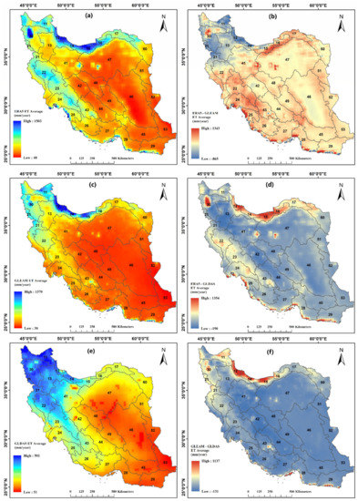 Long-term gridded average of ETERA5, ETGLEAM, and ETGLDAS in Iran (1980–2018) is illustrated in Figure 2a,c,e, respectively. All datasets show a wide spatial range of ET (ETERA5: 40–1502 mm/yr, ETGLEAM: 31–1369 mm/yr, and ETGLDAS: 51–501 mm/yr), although ETGLDAS range is much smaller compared with two other datasets. The general spatial pattern of ET is similar between the three datasets while ETGLEAM and ETERA5 are more alike, displaying for example, high values in the north of Iran, close to the Caspian Sea, and at some grid points in the south close to the Persian Gulf and Oman sea (Figure 1a), and low levels in central parts occupied by deserts. ETGLDAS shows a more extensive cover of low values, extending over areas in the north, northwest, and western region of Iran. The central to the south-eastern areas have a lower range of ET in all datasets, mostly in desert-lands with arid and hyper-arid climate conditions (Figure 1b).