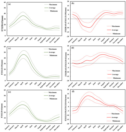 The ETERA5 has a higher base value than other datasets (minimum of ETERA5 = 12.3 mm, Figure 3a,c,e) while ETGLEAM has higher maximum values (46.1 mm, Figure 3c). These differences indicate that ETERA5 lower boundary is higher, and the maximum values of ETERA5 and ETGLDAS are lower than ETGLEAM (Figure 3b,d,f). Over the periods January–February and June–December, ETERA5 has a higher value than ETGLEAM (Figure 3b) and the maximum differences happened in May, and reached −9.2 mm. The minimum difference also occurred in February and corresponds to 2.3 mm. Over all the months, except February, the ERA5 estimated ET higher than GLDAS dataset (Figure 3d). The minimum is 0.3 mm, recorded in January, and a maximum of 9 mm occurred in August. Comparison of ET estimations of GLEAM and GLDAS show that during the period February–October, GLEAM provides higher values of ET (Figure 3f).