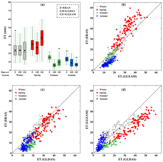 Figure 4b–d illustrate the seasonal discrepancies between ETGLEAM, ETERA5, and ETGLDAS. During the winter season, ETERA5 and ETGLEAM are distributed on both sides of the 1:1 line (Figure 4b). In spring, almost all ET points are located above the 1:1 line and inclined to the GLEAM axis (vertical). During summer and autumn, all points are located below the 1:1 line and inclined to the ERA5 axis (horizontal). A comparison between ETERA5 and ETGLDAS (Figure 4c) indicates that during the spring and summer, the GLDAS estimates higher values of ET and almost all points are located below the 1:1 line. However, during the autumn and winter, the points are distributed on both sides of 1:1 line; thus, in these seasons, they do not have special over/under differences. The comparison between the distribution of estimated ETGLEAM and ETGLDAS values illustrates that GLDAS have higher ET values, except in winter when points are distributed on both sides of 1:1 line (Figure 4d).