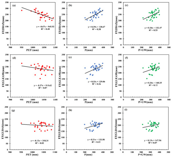 Figure 4a–c indicate the co-variation of ETERA5 with the PET, P and P+GW, respectively. The ETERA5 has higher co-variation with PET than P and P+GW. Conversely, the ETGLEAM shows lower co-variation with PET (R2 = 0.07) than P and P+GW, Figure 4d–f. The co-variation of ETGLEAM with P is 0.26, which decreases when considering GW as an additional water input flux (0.12) (Figure 5d–f). ETGLDAS has a low correlation with all drivers (Figure 5g–i) comparing with the two other ET datasets (ERA5 and GLEAM). The correlation of ETGLDAS with P is higher than other drivers, even than P+GW.