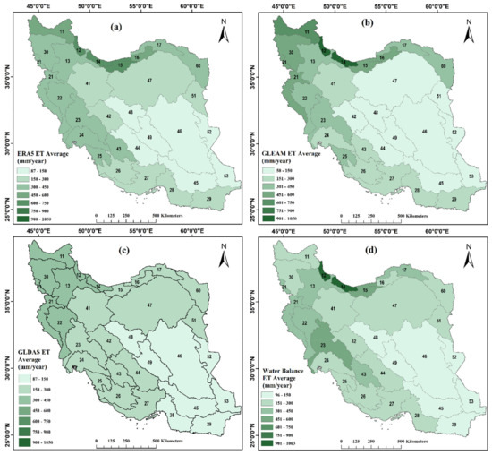 Comparing the results of the three global datasets (Figure 6a–c), some similarities are apparent, e.g., high values in the northern basins (12, 14, and15) which have higher level of average precipitation with humid climate condition, especially for ERA5 and GLEAM, and lower values in central basins (46, 49, and 48) of Iran. These basins are located in arid climate condition. The ETGLEAM is the dataset that has a wider spatial distribution of the lowest range (ET < 150 mm/yr) of ET among all of the considered ET estimation datasets, and it includes ten basins in the center, east, and south-east of Iran (42,44,45,46,47,48,49,51,52,53).
