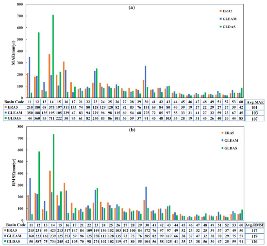 In addition to assessing the discrepancy in ET datasets, it is necessary to evaluate the error over the study period. The MAE and RMSE values of each basin dataset are displayed in Figure 8a,b, respectively. The lowest MAE with ETERA5 is recorded in basin 46 (19 mm/yr), while in the case of ETGLEAM, basin 52 has the lowest MAE (23 mm/yr), and the lowest MAE of ETGLDAS is for basin 46 (19 mm/yr). The highest MAE for ETERA5, and ETGLDAS are observed in basin 14 (373 mm/yr and 710 mm/yr, respectively), and basin 11 (350 mm/yr) for ETGLEAM dataset. The largest difference between MAE of ETGLEAM, ETERA5, and ETGLDAS is for basin 14, and the lowest is for basin 49. Generally, basins located in arid and semi-arid, central and eastern parts of Iran had lower MAE values, and basins located in humid northern parts had higher MAE (Figure 8).