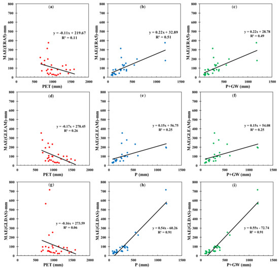 Co-variation of mean absolute error (MAE) of (a,b,c) ETERA5, (d,e,f) ETGLEAM, and (g,h,i) ETGLDAS with (a,d,g) potential evapotranspiration (PET), (b,e,h) precipitation (P), and (c,f,i) P + groundwater (GW).