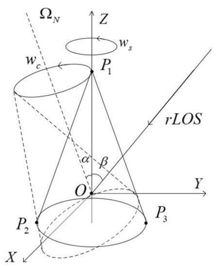 In this section, the geometric model and the signal model of the precession cone-shaped target are introduced. Figure 1 shows the model in the coordinate system , where the precession center of the target is located at the origin . The target spins around the target symmetry axis at an angular velocity , and rotates around the axis at an angular velocity , which forms the precession motion. For simplicity, and the radar line-of-sight (rLOS) are on the plane, and the symmetry is located at the Z-axis initially. The precession angle between the coning axis and the symmetric axis is , and the initial target line-of-sight angle between the symmetric axis and the rLOS is . The distance between the precession center and the radar is .