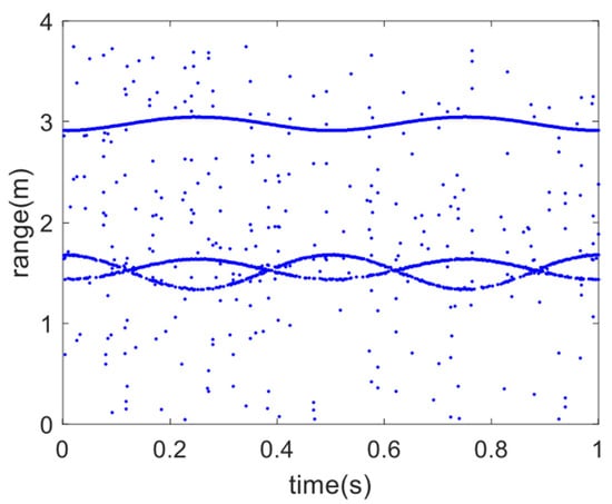 Solving Equation (10) is an NP-hard problem. The OMP algorithm can be used for (10) to attain the approximate solution. OMP is an iterative greedy algorithm. In this algorithm, the column of , which is most strongly correlated with the residual, is chosen, and the corresponding element in can be calculated in the meantime. Then, the residual is updated by subtracting the contribution of this signal component at each iteration until residual power is lower than noise power . The estimated coefficient vector can be obtained at last where the non-zero elements are the scattering coefficients and the indexes of non-zero elements correspond to the range cells of scattering centers. The range of scattering centers can be regarded as the extracted scattering center trajectories. The extracted scattering center trajectories are shown in Figure 2.