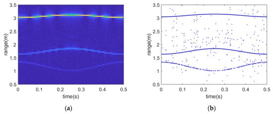 Figure 3a shows the range–time image when and the dwell time is 0.5 seconds. In this experiment, the scattering coefficients could be roughly estimated by the OMP algorithm, and the normalized estimated scattering coefficients were , and . Obviously, the echo energy scattered by was about 100 times than that scattered by the weak scattering center . Figure 3b shows the trajectory extraction result by the OMP algorithm. We could find that there were many missing trajectories when the dwell time was 0.25 s, making the m-R track of disconnected.