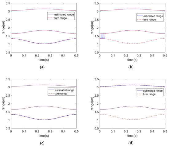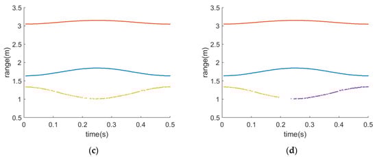 Under the condition where the initial target line-of-sight angle is , the range between the scattering center and the radar along the rLOS is close to that between the scattering center , and the radar which makes the m-R tracks of two scattering centers intersected. Figure 5a shows the range–time image when and the dwell time was 0.5 s. Figure 5b shows the trajectory extraction result by the OMP algorithm. The intersection makes it difficult to associate the trajectories. Figure 5c,d shows the associated segments obtained by the AKF and the MKF, respectively. Obviously, the intersection increased the wrong association probability and made the track broken.