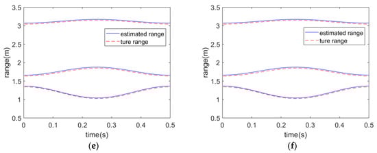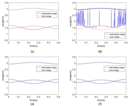 Figure 3c,d shows the associated segments obtained by the AKF and the MKF, respectively. In these figures, curves in different colors represent different segments. The missing trajectory and the inaccurate estimation make the inlier radio decrease, and the new track is created by the RANSAC algorithm. Therefore, the track of obtained by the MKF is broken into two segments. Figure 4a–f shows the estimated range results and true ranges for different methods, respectively. The proposed method and the RANSAC algorithm can obtain accurate m-R estimation. ESPRIT cannot obtain an accurate m-R estimation of the weak scattering center under a low SNR circumstance. The wrong associations by the Kalman filter occur when the missing trajectories exist. The GRT-CLEAN and GA-CLEAN algorithms can obtain complete and accurate m-R curves, but they are restricted by the range resolution of the m-R image.