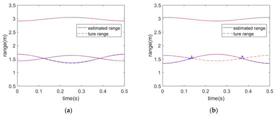 In this experiment, the SNR of echoes were set to be 10 dB and the initial target line-of-sight angle was . The process noise covariance matrixes were , where denotes the diagonal element of the and is set to range from 0.1 to 1. We used two sets of data, where the precession rates were set to be and . Figure 7 shows the range–time image when the precession rates were and , respectively. We found that the m-R tracks on were smoother than those on . Therefore, the theoretical diagonal element of the process noise covariance matrix should be larger when . Figure 8 shows the MRMSE of the AKF and MKF with different process noise covariance matrixes, where the blue markers show the MRMSE of the MKF and the red markers show the MRMSE of the AKF. In Figure 8a, the MRMSE is smallest when the noise variance of MKF is , indicating that is closest to the theoretical noise variance when . Since the calculation of the AKF does not need the noise variance, the MRMSEs with different process noise covariance are the same, and the MRMSE of the AKF is lower than that of the MKF. In Figure 8b, the MRMSE is the smallest when the noise variance of MKF is , indicating that is closest to the theoretical noise variance when , which is a little larger than when . The experimental results demonstrate that the AKF can obtain higher estimation accuracy than the MKF with different process noise covariance matrixes.