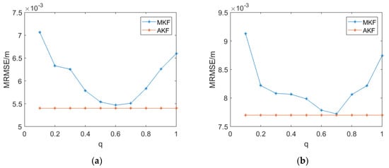 The MRMSE results with different process noise covariance matrixes. (a) The precession rate is ; (b) The precession rate is .