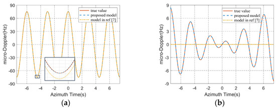 - With different heading angles, the micro-Doppler caused by angular oscillations has significant differences. According to Equation (33), the mean micro-Doppler introduced by roll motion is determined by . Bring the simulation parameters into this formula, when the heading angle is 0° and 90°, the mean micro-Doppler of point P introduced by carrier rolling is –5.45 Hz and 5.45 Hz, respectively. The calculation results agree well with simulation results in Figure 9e, which proves the validity of the proposed model.