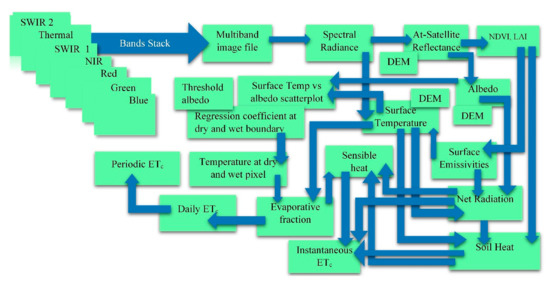 Figure 3 is the computational flowchart of SEB components by S-SEBI. The peculiar feature of the SSEBI model is that it does not require any meteorological data [19] and the model algorithm is also comparatively simpler. The S-SEBI model is based on the correlation observed between Ts and α (Figure 4). The concave Ts vs. α relationship is divisible into the evaporation-controlled and radiation-controlled zone. At the evaporation-controlled zone, Ts is first more or less constant and then starts to increase with increasing α value. Beyond a certain threshold value of α, Ts decreases with increasing α which is the radiative zone. This correlation is used to calculate Λ (Equations (20)–(22)).
