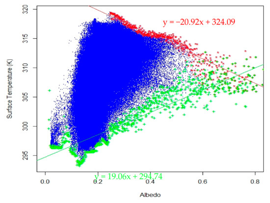 Scatterplot of Surface albedo and surface temperature (Ts) for Landsat path/row 37/29 on 2 July 2018.