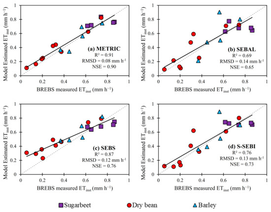 The fact that the 2018 growing season had nine images spread across the growing season can lead to disproportionally more accuracy for the dry beans as compared to sugar beet (2017 with five images) and barley (2019 with five images) (Table 1). An analysis of temporal biases towards the end of the 2018 growing season was carried out to better understand the model performance. For that, 2018 images from mid-July to September (resembling the images from 2017 and 2019) were analyzed and compared with BREBS measurements. The results revealed that METRIC, SEBAL, SEBS and S-SEBI explained 87% (RMSD = 0.09 mm h−1, NSE = 0.76), 48% (RMSD = 0.16 mm h−1, NSE = 0.20), 91% (RMSD = 0.12 mm h−1, NSE = 0.55), and 57% (RMSD = 0.15 mm h−1, NSE = 0.32) variability in measured ETinst, respectively (data not shown). A reduction in correlation statistics, i.e., R2, NSE, and higher RMSD reveal some degree of temporal biases in all models.