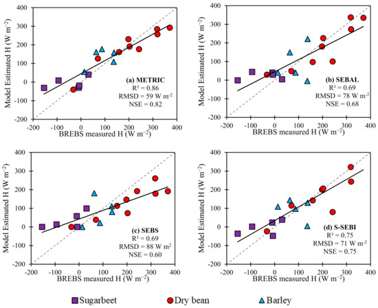 A comparison of surface energy balance (SEB) model-estimated H flux (W m−2) (a) METRIC, (b) SEBAL, (c) SEBS, and (d) S-SEBI with BREBS-measured H at the BREBS flux-tower footprint located in PREC, Powell, Wyoming for three vegetative surfaces.
