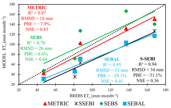 In general, monthly ETc is more desirable for hydrological applications (e.g., seasonal irrigation requirement, conveyance capacities of irrigation systems, etc.) as compared to ETinst and ET24. In this study, the monthly ETc was calculated from ET24 using cubic interpolation [25]. Figure 7 depicts the performance of the SEB models on estimating the monthly ETc. For that, the model predicted monthly ETc for the 2018 growing season (May to September) were plotted against BREBS-measured corresponding flux. For all the models, moderate to high correlation was observed between measured and estimated ETc with R2 ranged from 0.70 to 0.95 and RMSD ranged from 18 mm for METRIC to 34 mm for S-SEBI. In general, all the models underestimated the seasonal ETc, except SEBS. However, METRIC stood out to be best-performing model owing to its lower RMSD (17.6 mm) and lower percentage error (−7.9%) followed by SEBS (RMSD = 25.8 mm, %error = +6.6), SEBAL (RMSD = 33 mm, %error = −29) and S-SEBI (RMSD = 34.3 mm, %error = −31). METRIC monthly ETc ranged between –38% (underestimation) in June to 18% (overestimation) in October. The over and underestimation of the estimated monthly ETc was higher when the soil surface was devoid of active leaf area cover. The dry bean at the BREBS footprint was planted on 5 June and harvested on 10 September. Similarly, overestimation (46%) was observed for SEBS-derived ETc in October after the dry bean harvest. Contrary to this, consistence underestimation ranging between 18% to 55% was observed for SEBAL and S-SEBI.
