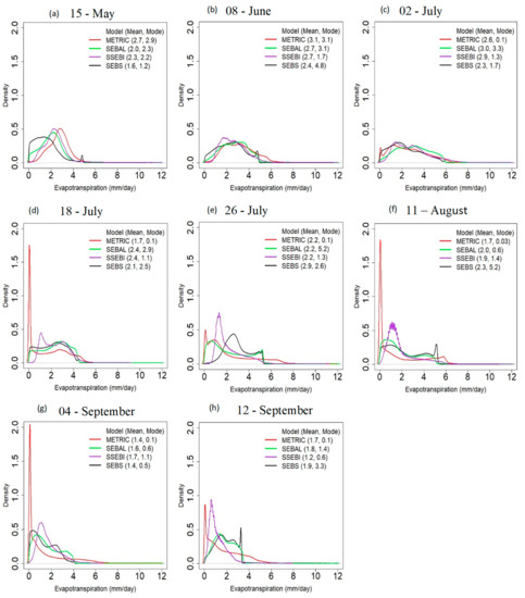 Density plot of SEB model estimated ET24 (mm d−1) on: (a) 15 May 2018; (b) 8 June 2018; (c) 2 July 2018; (d) 18 July 2018; (e) 26 July 2018; (f) 11 August 2018; (g) 4 September 2018, and (h) 12 September 2018. (Embedded within each density plot is the mean and mode of ET24 for the corresponding model).