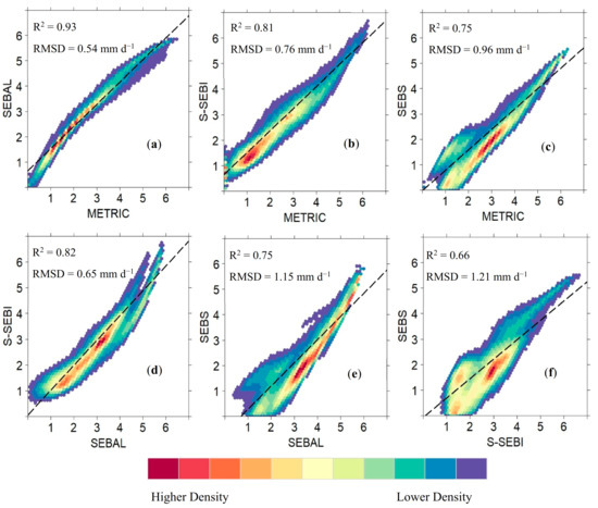 Density plot comparison of ET24 (mm d−1) between (a) METRIC vs. SEBAL; (b) METRIC vs. SSEBI; (c) METRIC vs. SEBS; (d) SEBAL vs. SSEBI; (e) SEBAL vs. SEBS; (f) SSEBI vs. SEB for 2 July 2018 at image spatial scale.