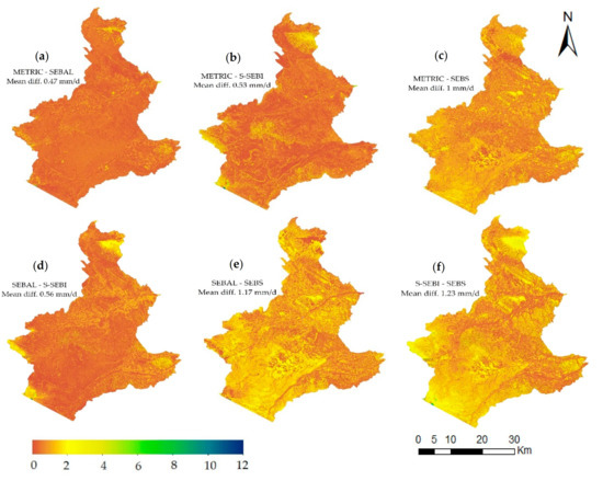 Absolute difference map between ET24 on 2 July 2018 estimated using different energy balance models: (a) METRIC-SEBAL; (b) METRIC-S-SEBI; (c) METRIC-SEBS; (d) SEBAL-S-SEBI; (e) SEBAL-SEBS; (f) S-SEBI-SEBS.
