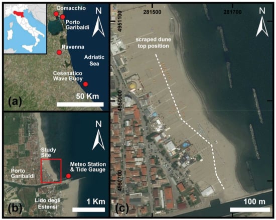 Index map of the study area: (a) the Emilia-Romagna (red region) coast in the Northern Adriatic; (b) the Porto Garibaldi (Comacchio) area; (c) the study site, just north of the canal harbour of Porto Garibaldi. The locations of measuring stations are highlighted in (a,b).