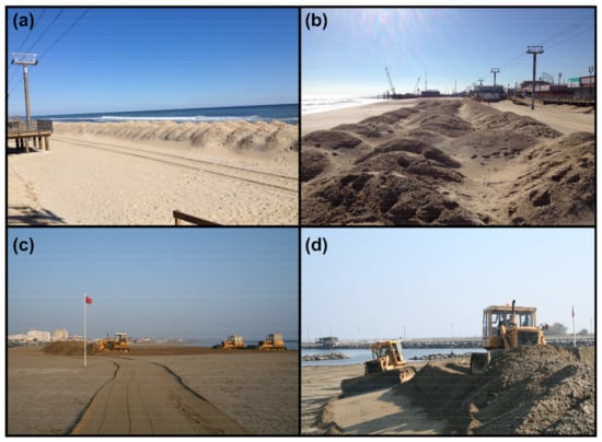Artificial dunes are human-made sandy features built on an emerged beach to protect the inner part of the coast and its assets. Acting as barriers and sand deposits, they offer an effective countermeasure to flooding and erosion when properly designed (Bruun, 1983 []). The so-called “winter dune” investigated in this study—unlike the artificial dunes in Figure 2a and b that are examples of long-/medium-term measures—is a temporary small-scale measure put in place as a seasonal protective measure. Every autumn before the storm season, it is built at several locations along the Emilia-Romagna (Italy) coast (Figure 1 and Figure 2c,d) and is dismantled in spring before the touristic season begins (Harley and Ciavola, 2013 []). Temporary dunes or embankments are generally built by beach scraping (see examples in Figure 2c,d), which consists of moving the sand of the beach from where a surplus is available to the desired position by means of machines, such as bulldozers (Bruun, 1983 []). This represents the most commonly applied approach (e.g., Bruun, 1983; Wells and McNinch, 1991; Harley and Ciavola, 2013; Cooke et al., 2012 [,,,]) when enough sediment is available, as it is fast and non-expensive compared to building dunes with nourished sand.