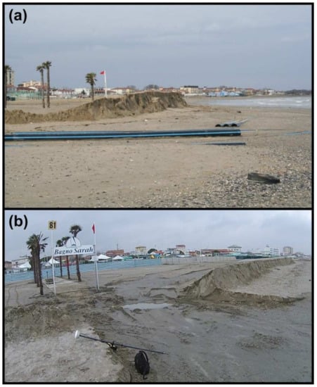 The Emilia-Romagna coast (Figure 1a) on the Northern Adriatic is about 130 km long and is characterised by low-lying sandy beaches, alternating highly touristic and natural protected areas. The human pressure is high with main infrastructures, economic and touristic activities located within a few kilometres (or even hundreds of metres) from the shoreline. This, in combination with the morphological characteristics of the coastal corridor (i.e., low elevation; with lagoons, wetlands and highly managed canals) and the hydrodynamics of the Northern Adriatic (i.e., microtidal; low energetic wave climate; intense ENE and SE wave storms, in combination with extreme storm surges), increases the level of risk for flooding and erosion (Armaroli et al., 2012 []). Indeed, the regional coast is threatened by extreme coastal events that cause damages to its residents and economy (Armaroli et al., 2012; Armaroli and Duo, 2018 [,]). Armaroli et al. (2012) [] provided a thorough classification of potential damaging events, identifying the combined critical thresholds for waves (i.e., significant wave height, Hs) and total water levels (TWLs) for natural beaches with dunes (Hs > 3.3 m, and TWL > 0.85 m), and anthropic ones (Hs > 2 m, and TWL > 0.7 m). Regional coastal managers, often supported by local research groups, are active in assessing coastal risk and updating disaster risk reduction (DRR) solutions (e.g., Perini et al., 2016 []), such as the so-called “winter dunes”.