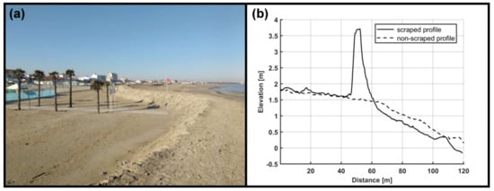 The construction of artificial (temporary) dunes in Emilia-Romagna is a long practiced tradition (Armaroli et al., 2012 []). As the beach surface is highly exploited for tourism, these features are built on the emerged beach during the winter season to protect the beach concessions from flooding and erosion due to coastal storms. Local companies take care of building the artificial protections through beach scraping (Figure 2c,d) or sand replenishment (less frequent option), basing their work on hands-on past experience. Therefore, in general there is no clear control over the design of the dunes and the way that beach scraping may affect the morpho-hydrodynamics of the beach at the local level. Nonetheless, guidelines on how to properly build such temporary measures exist at the regional level (Regione Emilia-Romagna, 2011 []) and are further adopted at the national level (MATTM-Regioni, 2018 []). They were mostly based on research outcomes of local scientists. Harley and Ciavola (2013) [] numerically studied the cross-shore behaviour of artificial dunes in the Ravenna area, proposing design guidelines and methods. Recently, Scarelli et al. (2017) [] focused on the evolution of artificial dunes (“bulldozer dunes” in their paper) during the winter season of 2014–15 in the Ravenna area by analysing the products of two drone-based surveys. This study highlighted the importance of these temporary measures in protecting beach concessions, but also pointed out the considerable morphological variations induced by their construction. A more recent numerical investigation by Sanuy et al. (2018) [] quantified the effectiveness of this particular DRR for the Ferrara area: in current and climate change scenarios, flooding was consistently reduced by applying artificial temporary dunes but they were less effective in reducing erosion.