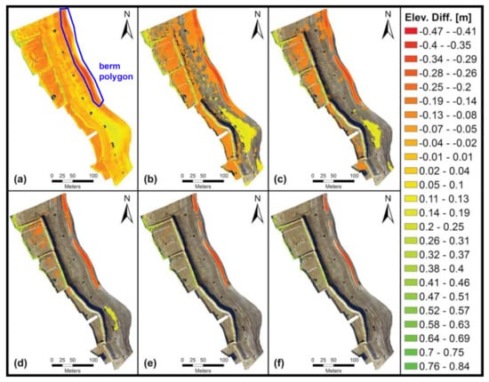 Morphological variations between the survey of 21 December 2016 and 20 January 2017 calculated through the minimum threshold for change detection. The thresholds for change detection are as follows: (a) none (the polygon used to calculate morphological changes on the northern berm only is also shown), (b) 0.05, (c) 0.10, (d) 0.15, (e) 0.20 and (f) 0.25 m. The legend on the right indicates the magnitudes of the variations, which is negative for erosion and positive for deposit.