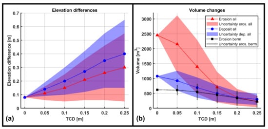 Finally, the repeated empirical assessment of the maximum water elevation is comparable to the field (drone-based) observations. On the one hand, this result suggests that the setup component is almost fully captured by the local tide gauge. On the other hand, it proves that the coastal storm can explain the eroded area as the result of the berm erosion. Since the last survey was performed a few hours after the end of this event, post-event recovery can be excluded. However, some recovery may have occurred during the analysed period, between the identified (minor) coastal events as immediate post-storm deposition (Phillips et al., 2017 []). This means that the results could be slightly underestimating the real loss of sediment. Notably, the berm area in the south of the domain did not show significant changes for TCD > 0.15 m. Indeed, this area is well protected by breakwaters (Figure 1c) for minor-medium events and actually showed some deposition for lower detection thresholds (Figure 8a–d). Considering the direction of the last coastal event (ENE), it is possible that part of the sediment eroded from the northern berm deposited there. In any case, the deposition is lower than the volume eroded from the northern berm, as can be deducted by observing Figure 9b: the deposited volume just slightly increases by decreasing the TCD, meaning that the contribution of this specific detected deposit is limited compared to the other considered volumes. This possibly suggests that the eroded sediment was prevalently transported in the submerged area, trapped between the shoreline and the breakwaters, contributing to the overall loss of sediment from the surveyed domain.