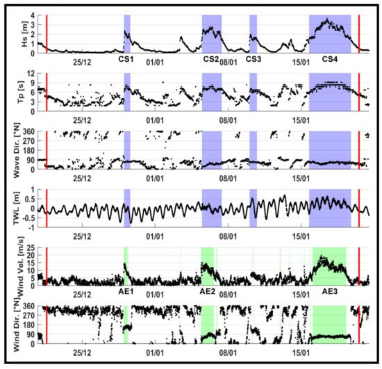 Four coastal storms were identified. The first two events (labelled as CS1 and CS2, respectively) showed Hs with peaks of 2.3 (main direction ENE; duration 14.5 h.) and 2.8 m (main direction NE; duration 45.5 h.), respectively, and maximum TWLs lower than 0.25 m. The third event (CS3) showed maximum Hs of 1.9 m and a max TWL of 0.53 m. The last storm (CS4) showed maximum Hs of 3.6 m and a max TWL of 0.63 m. The third and fourth coastal events, both coming from ENE, had durations of 17 and 96.5 h., respectively.