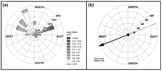 Wind climate for the period 21 December 2016–20 January 2017: (a) the wind rose based on wind blowing directions; (b) the sand rose calculated considering the wind climate and sediment grain size.