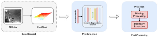 Illustration of overall framework of the proposed method. The pre-detection module takes the point cloud data transformed from DEM data as input, and outputs the preliminary prediction results. Next, the preliminary detection results are refined in the post-processing module.