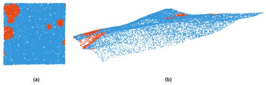 Point cloud dataset. (a) shows a vertical view of an area in the point cloud dataset, and red marks the impact craters. (b) represents the point cloud data of the region from another perspective.