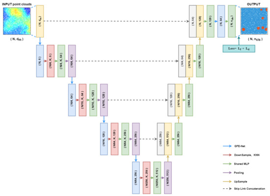 In the pre-detection module, a point cloud semantic segmentation deep learning network is adopted to pre-detect the point cloud data, which are converted from DEM data and then provide preliminary detection results(shown in Figure 4). In this study, a new network is implemented based on pointnet++ architecture [35], shown in Figure 5. In this study, the point cloud semantic segmentation network consists of the downsampling stage and the upsampling stage. The downsampling stage and the upsampling stage are connected by the multi-level skip links. After the point cloud data is inputted into the point cloud semantic segmentation network in this study, four operations of “global feature exchange network- sampling-shared multilayer perceptron-pooling” are conducted in the downsampling stage. To be specific, the global feature exchange network (GFE-Net) refers to a sub-network proposed for learning global features. More details regarding GFE-Net ware presented in the following sections. The output features from the downsampling stage will undergo multiple “concatenation-upsampling-shared multilayer perceptron” operations. The skip link combines the multi-level features of the downsampling stage and the upsampling stage through “concatenation”. All multilayer perceptron in the network use the modified linear unit (ReLu) as the activation function. The last layer of the network outputs the probability that each point pertains to each category.