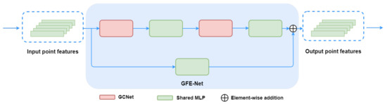 To allow the network to learn global features, the network should be endowed with information aggregation capabilities. To this end, a new network module termed as GFE-Net is proposed, shown in Figure 6. GFE-Net receives the point features from the previous layer as the input. Besides, it employs an attention module to fuse the global features, and finally passes the output for new features to the next layer. This study adopts Global Context Network (GC-Net) [48] as the attention module. GC-Net simplified Non-local Network and integrated with the Squeeze-and-Excitation Networks (SE-Net) [49]. It saves the integration of global information aggregation capabilities, which avoid the expensive computation. Moreover, a residual mechanism is adopted to maintain the flow of low-level information to high-level information. The output O of GFE-Net can be expressed as: