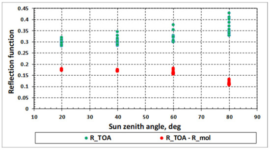 A cloud mask includes the detection of clouds and snow pixels, the separation of one from the other, as they can be indistinguishable in the visible region. A special attention is given to the detection of high cirrus clouds. Methods to discriminate clouds and snow pixels used in various algorithms varies markedly, but, of course, all of them are based on a high reflectance of clouds and snow. As was shown in [10], when clouds completely cover a pixel, . However, to discriminate clouds over bright desert-like surfaces, even the criterion ( is the reflection function (RF) at the TOA) is unsuitable at some observation geometry because it cuts off not only cloudy, but also cloudless pixels (Figure 1) due to the significant contribution of molecular scattering. Therefore, the detection of optically thick cumulus clouds and snow pixels is proposed to be carried out according to the following criterion: