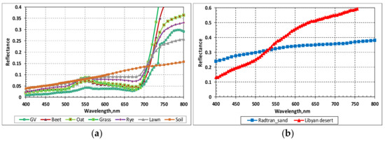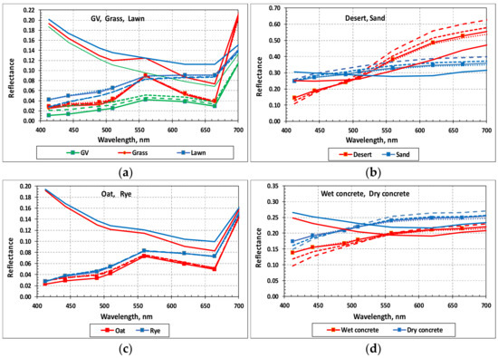 - 12 types of underlying surface, seven of which relate to dark surfaces such as vegetation (green vegetation (GV), oat, grass, rye, beet, lawn, soil), and five surfaces are bright (desert, sand, loam, dry and wet concrete);