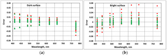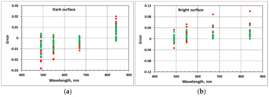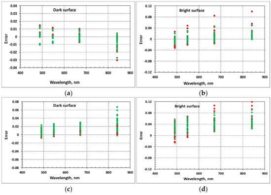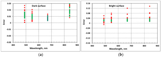 Errors of the spectral reflectance retrieval in the MZ channels are presented in Figure 6. Naturally, in this case as well, the maximum error of surface reflectance retrieval for dark surfaces occurs in the short-wave MZ channel, wherein it does not exceed 0.015. Table 6 presents RMSE for the surfaces’ reflectance retrieval computed with these data. These errors are less than 0.01 for dark surfaces, about 0.02–0.03 for bright surfaces at the solar zenith angle of 60°, and about 0.01–0.02 at the solar zenith angle of 20°.
