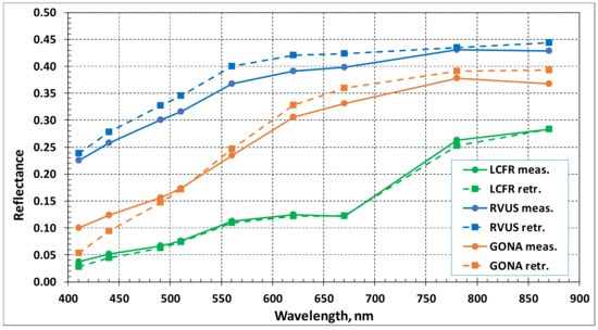 The results of retrieving spectral reflectance of surfaces with the RACE algorithm in comparison with the data of reflectance ground measurements.