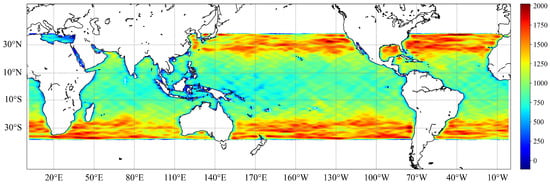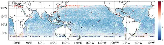 In this study, we used CCMP v02.0 (2017–2018) and v02.1.NRT (2019–2020) winds to assess the accuracy of the NOAA CyGNSS v1.1 product in global oceans. Here, we present the comparison of the CyGNSS/CCMP collocations during the period between May 2017 and December 2020. For illustrative purposes, Figure 2 shows the distribution of CyGNSS/CCMP collocations in global oceans. It can be seen that the area from 38 S to 38 N can be observed by CyGNSS due to the limitation of orbit []. The detectable area depends on the specular point of the associated global positioning system (GPS) transmitting satellite and CyGNSS receiving satellite []. The CCMP wind was regarded as the ground-truth observation, and was used to evaluate the performance of the NOAA CyGNSS wind product. CCMP wind was collocated with each CyGNSS specular point on the basis of the spatial and temporal collocation criteria. After the CyGNSS/CCMP collocating procedure, the total number of matchups was ∼7.45 million for May 2017–December 2020.