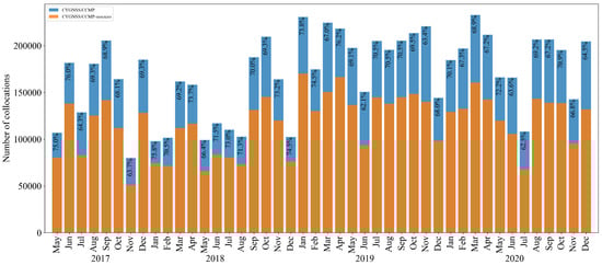 According to the flag named nobs from CCMP as mentioned above, CyGNSS/CCMP collocations were divided into CCMP-zero and CCMP-nonzero as shown in Figure 1. Figure 3 shows the volume of collocation data over the global oceans during the period between May 2017 and December 2020. The percentages per calendar month are displayed in each bar; the number of collocations is relatively lower in 2018 overall. The average percentage was 70.2% from 2017 to 2020. We found that the percentage of CCMP collocations with observation data flags was more than 60% in each month. This provide valuable collocations for us to assess the accuracy of the NOAA CyGNSS v1.1 product.