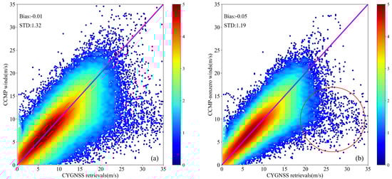 Scatterplot of CyGNSS/CCMP collocations in global oceans during the period between May 2017 and December 2020. (a) Scatterplot of CyGNSS/CCMP collocations. (b) Scatterplot of CyGNSS/CCMP-nonzero collocations. The color density represents the log of the number density of matchups. The red circle represents the part of inversion anomaly.