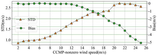 Figure 5 illustrates that the averaged metrics for wind speed ranging from 2 to 25 m/s were calculated according to the CCMP-nonzero wind speeds. The biases are close to zero, associated with small oscillations, and SDs are within 2 m/s in the range of 2 to 12 m/s, which shows that CyGNSS wind is very consistent with the CCMP-nonzero wind. However, average bias decreases with the increase in the CCMP-nonzero wind speed ranging from 12 to 25 m/s. We noted that the CyGNSS retrievals showed a large error for high wind speeds, which may be GNSS-R observations become relatively insensitive to high wind. Moreover, high wind is a very small proportion of the total, which produces instability when modeling the empirical model.