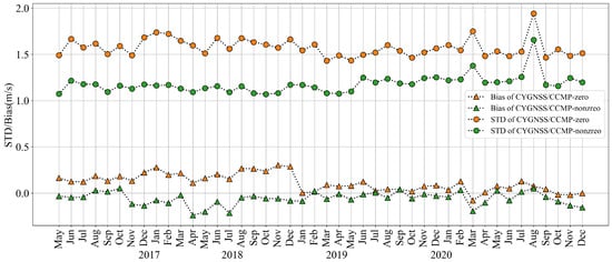 The overall performance of NOAA CyGNSS v1.1 compared with CCMP was evaluated in this study. Scatterplots of the wind speeds between CyGNSS and CCMP are presented in Figure 4, which show the global statistics for CyGNSS winds against the reference CCMP winds in the form of bias and SD. The average SDs of CyGNSS/CCMP and CyGNSS/CCMP-nonzero were 1.32 m/s and 1.19 m/s during the period between May 2017 and December 2020, respectively. This result is consistent with the analyses in [], which reported that NOAA CyGNSS v1.1 against ECMWF achieved an SD of 1.19 m/s for wind speed.