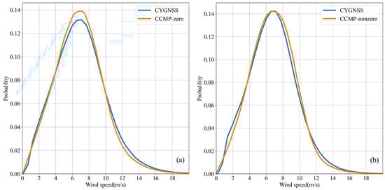 Probability distribution functions (PDFs) of (a) CyGNSS/CCMP-zero and (b) CyGNSS/CCMP-nonzero collocations. Note that CyGNSS/CCMP-zero indicates that the nobs flag of CCMP collocations is zero, and CyGNSS/CCMP-nonzero represents the nobs flag of CCMP collocations being nonzero.